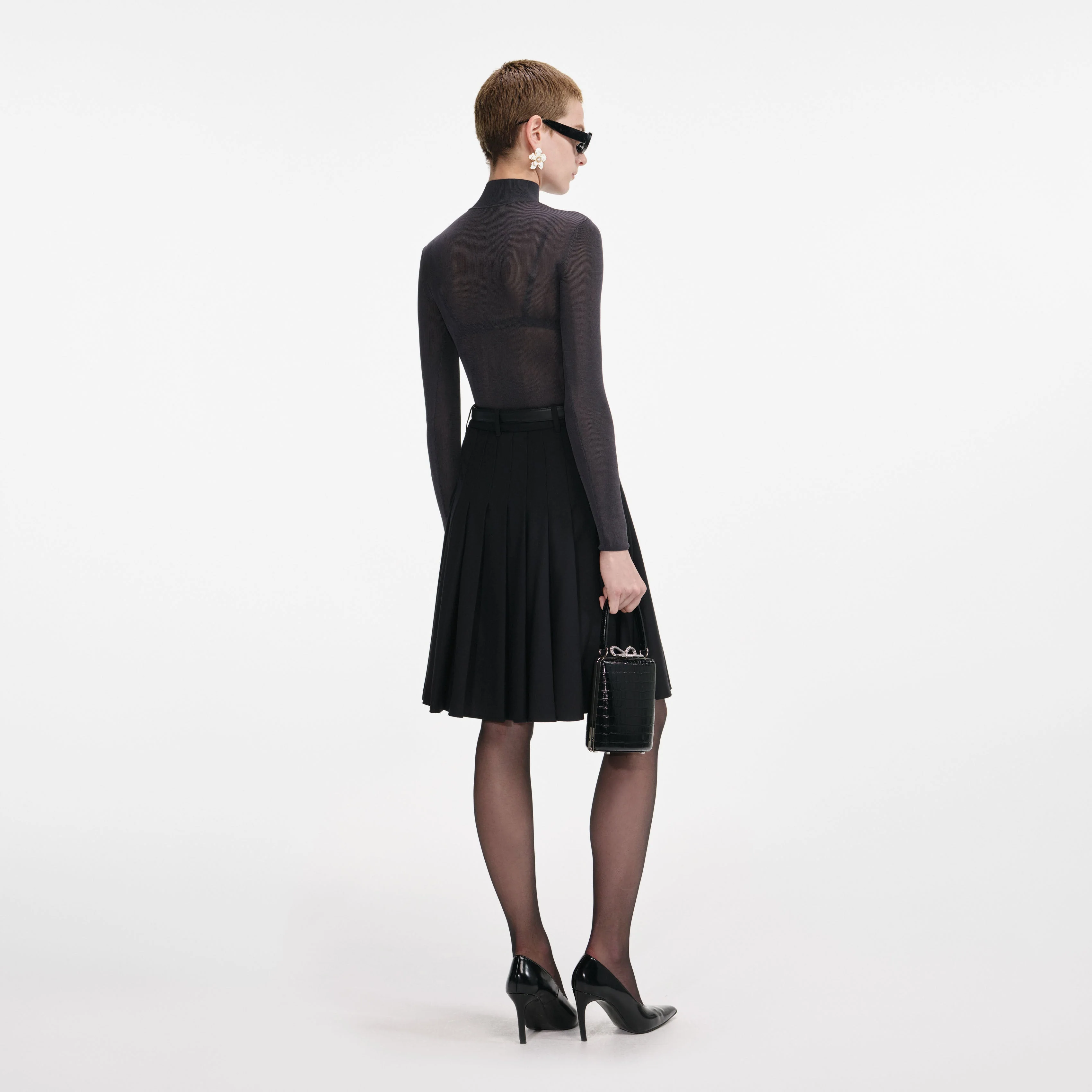 Preppy chic with a sensual twist, this pleated midi skirt is cut from black twill for its satisfying structure. A side slit adds extra intrigue – wear with a t-shirt and brogues for work and play.