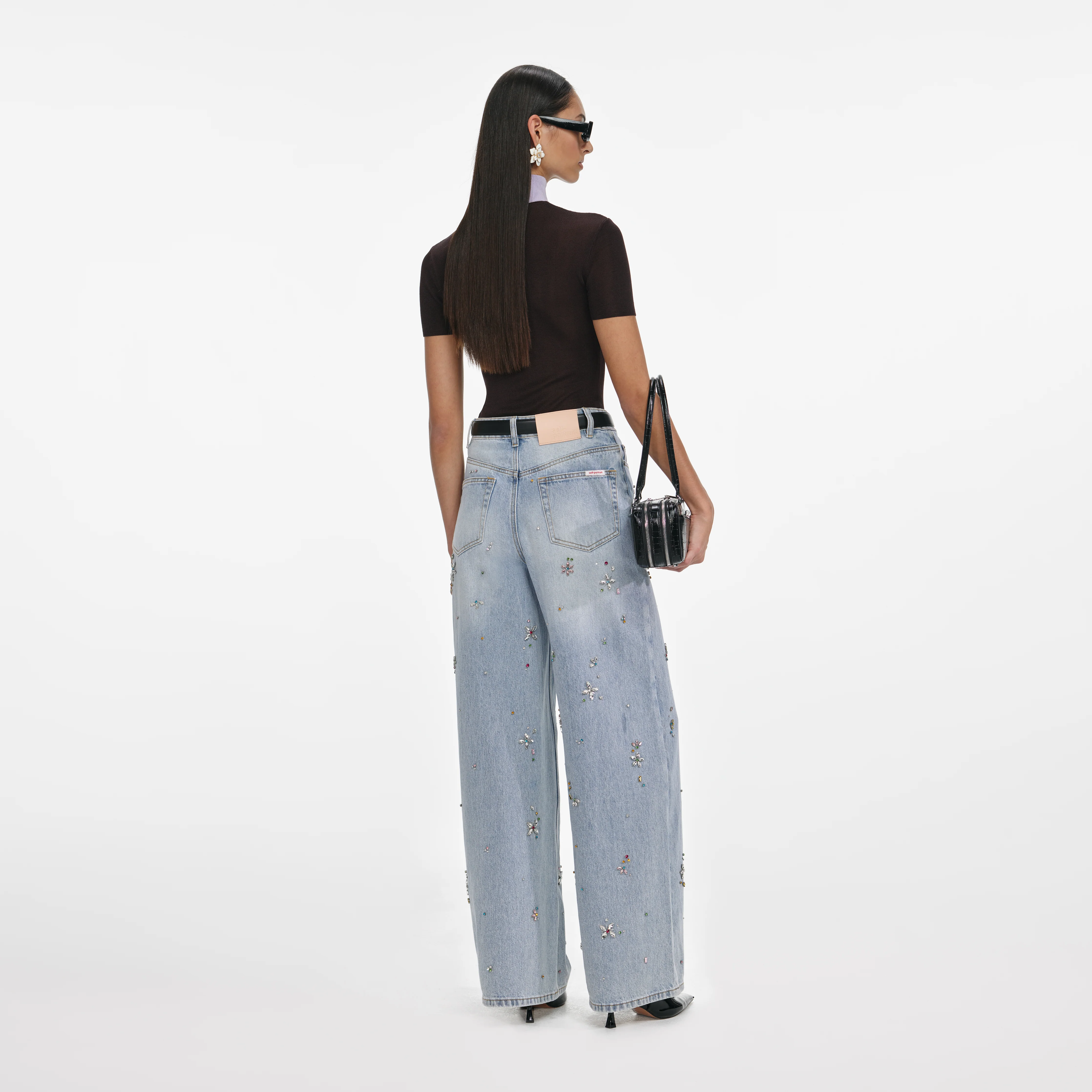 Denim goes disco with these light blue high-waisted jeans, embellished all-over with diamanté flowers. A wide-legged fit gives it boho chic appeal – style it with a crop top for girls’ night out.